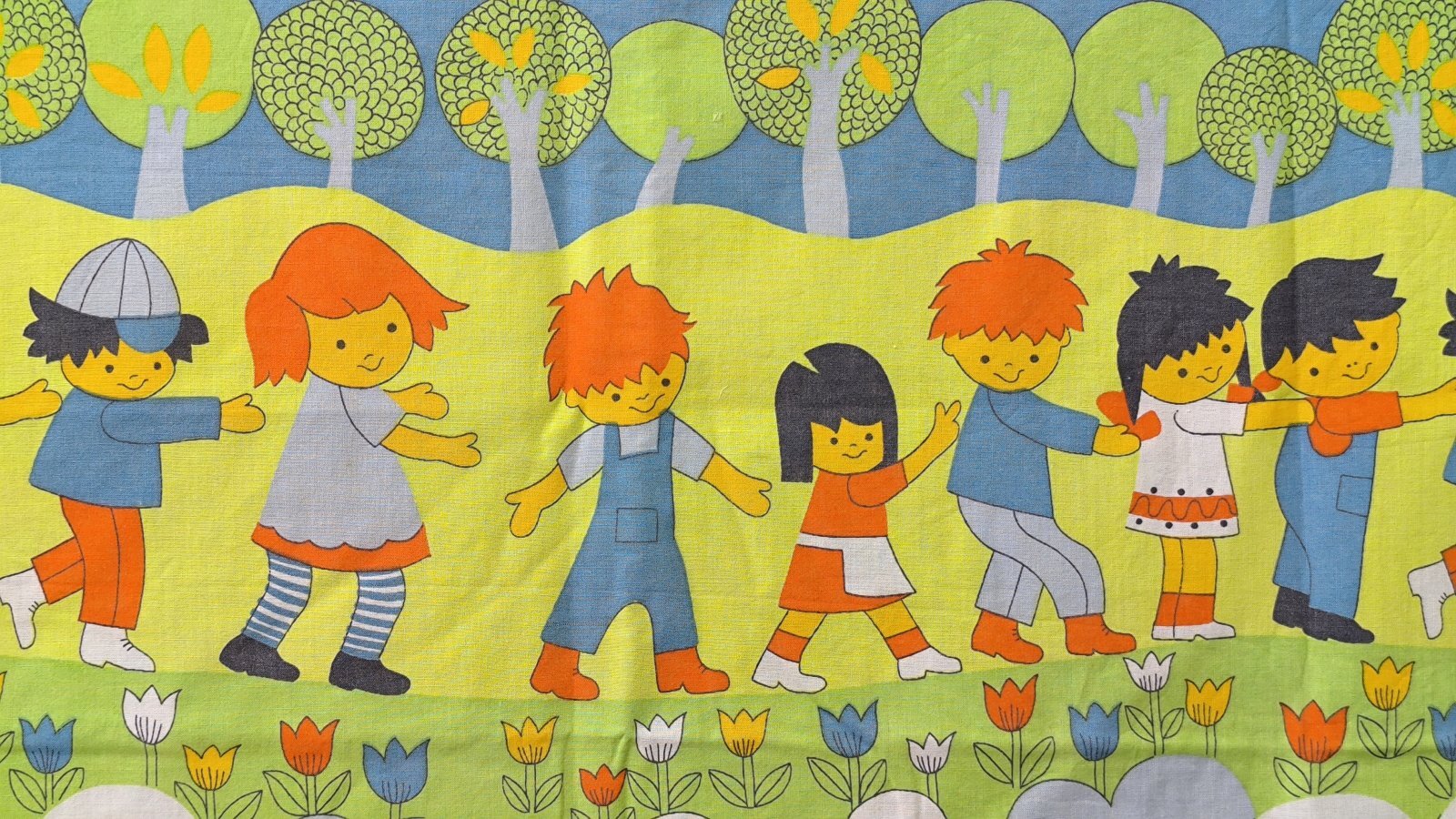 70's★子供たちとアヒルの群れ(ブルー系はぎれ)