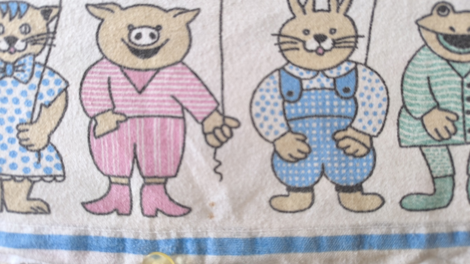 真ん中あたりのピンクの豚さんの右下の余白に、小さな薄いシミがあります(画像4)。