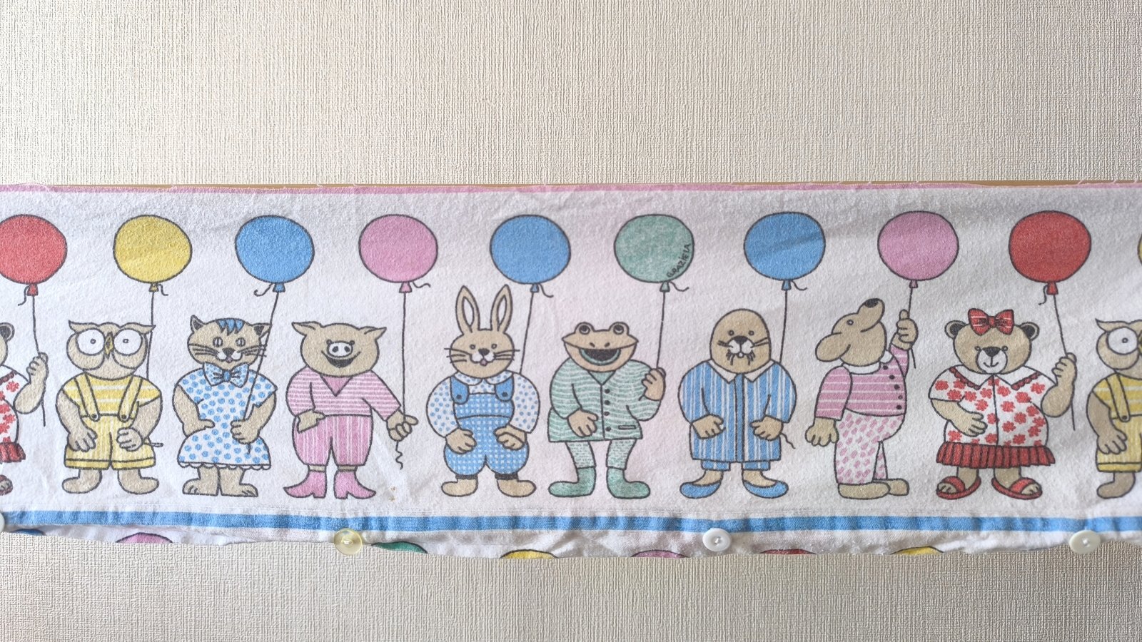 オマケのハギレは、可愛い動物が風船を持って並んでるイラスト。カエルが持っている緑色の風船にはGRAZIELAの文字。アップリケや、絵柄ごとに綿を詰めてニギニギを作るのも可愛いかも♪