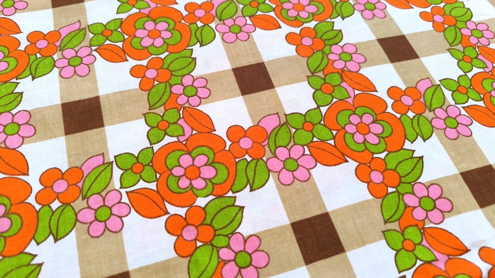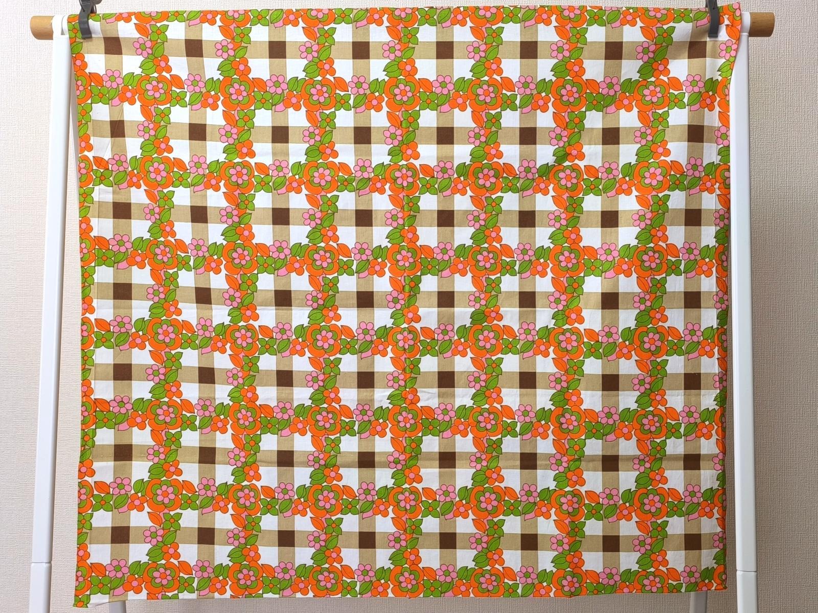 オレンジ、ピンク、黄緑のお花に、茶色のチェック。とても可愛くて人気の生地です♪