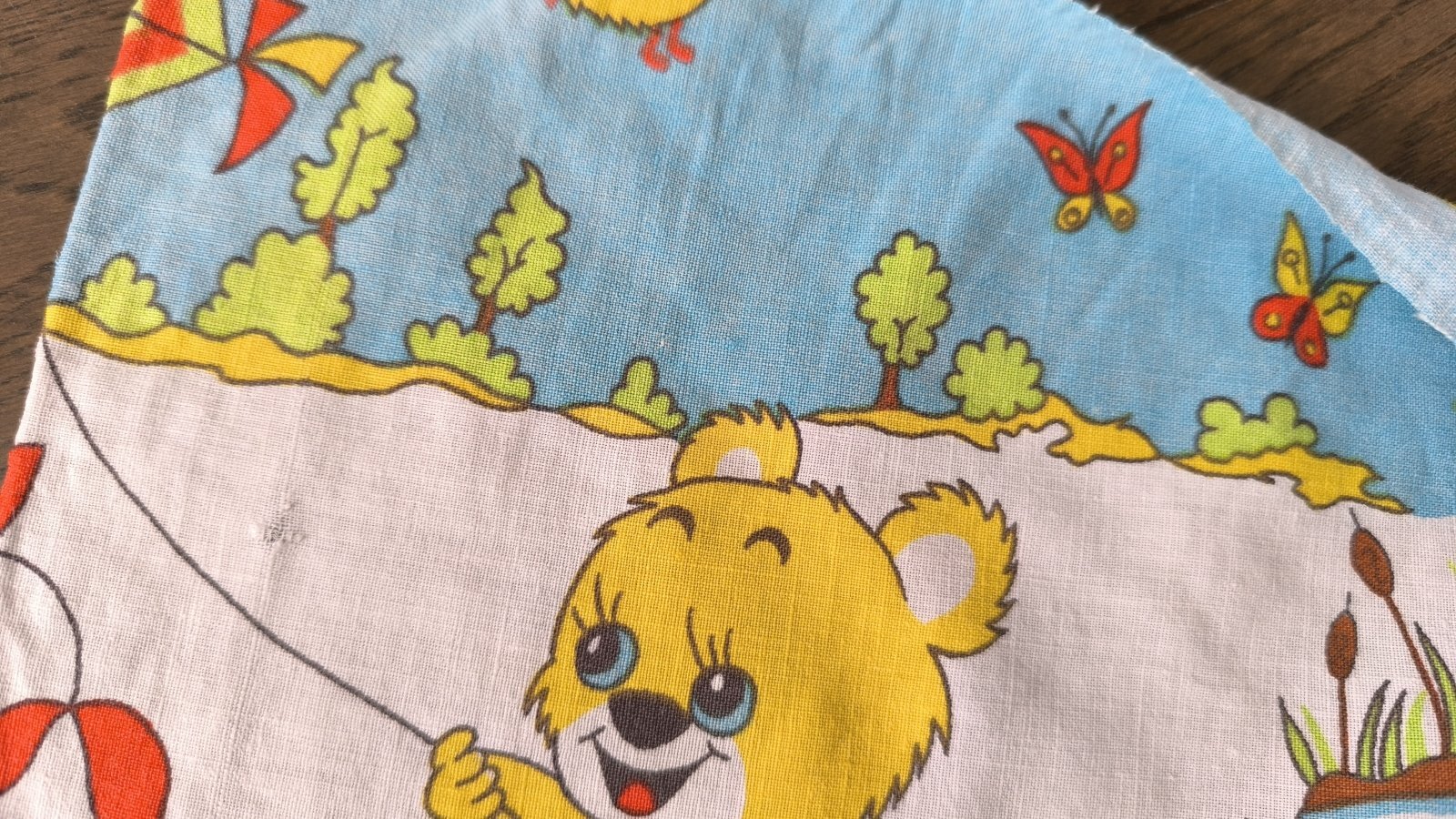 ハンドメイド用にユーズドシーツの糸をほどきました。生地の端の方、黄クマの目線の先に小さなダメージがあります(画像5)