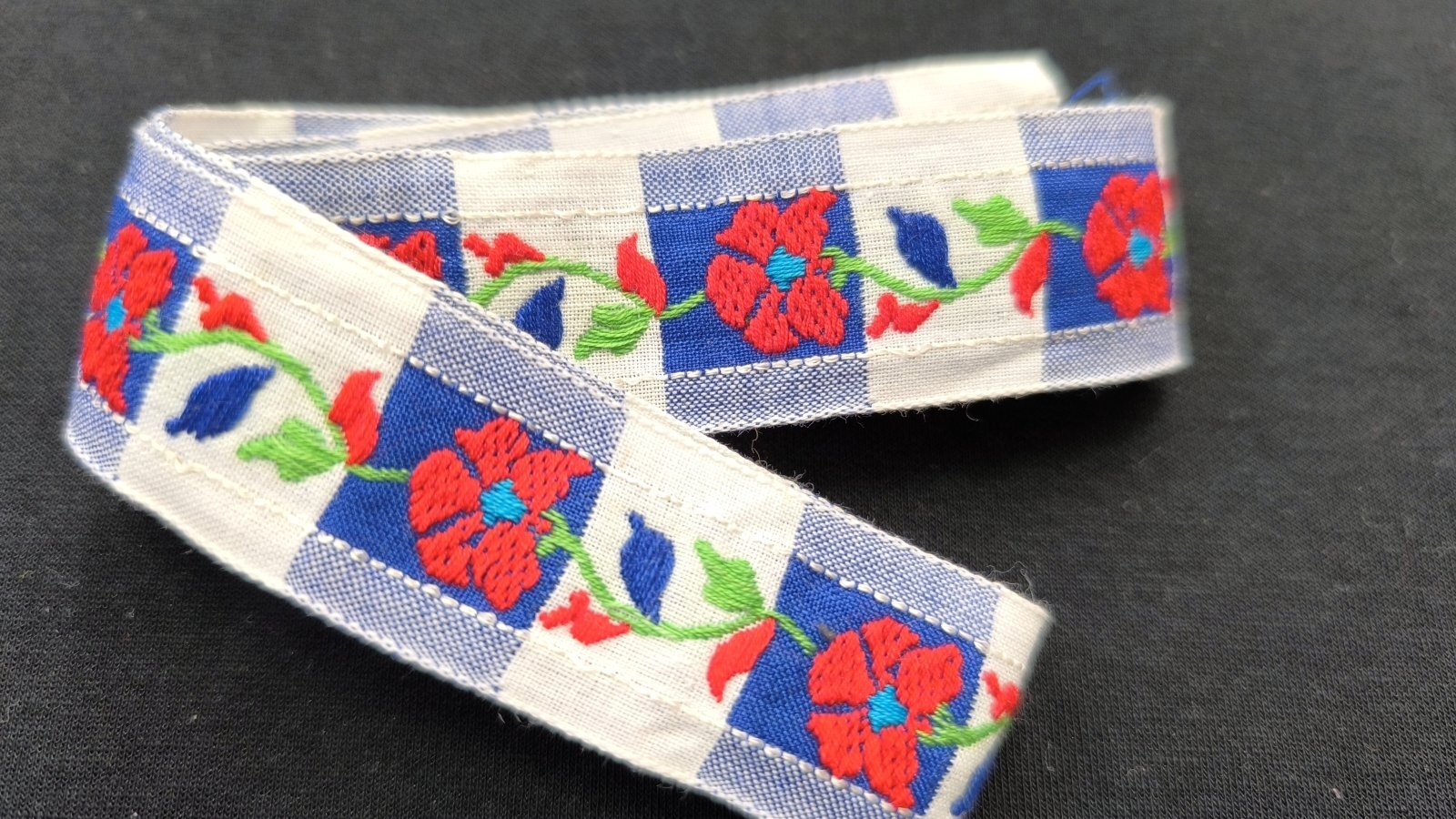 ホーム | 手芸グッズ > チロルテープA【84cm】青×白の背景に、赤い花のチロル